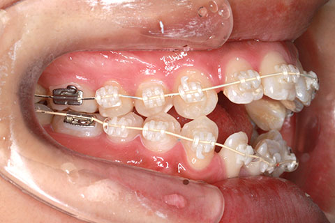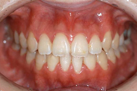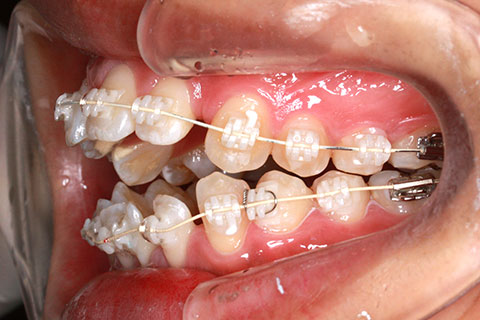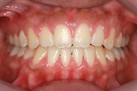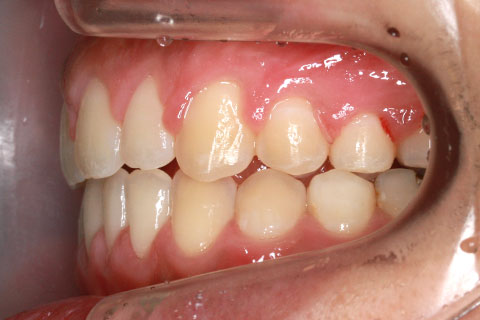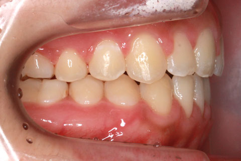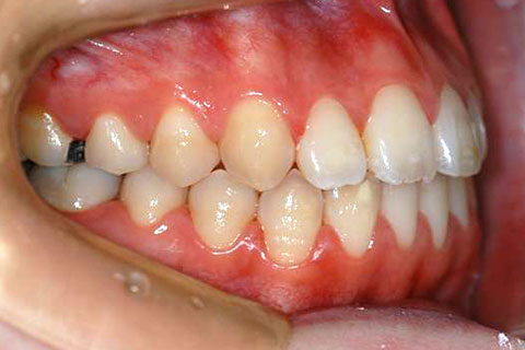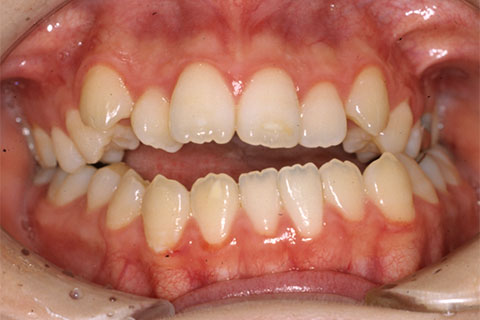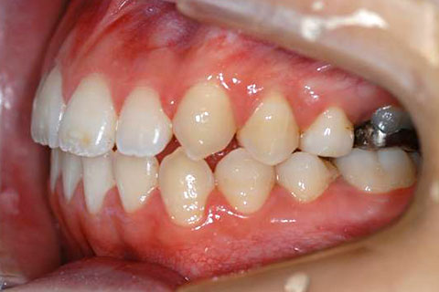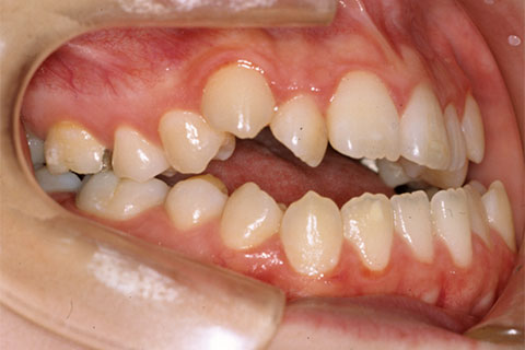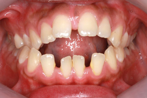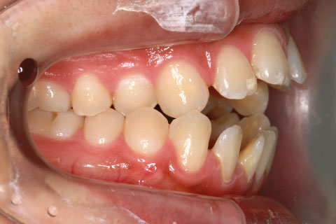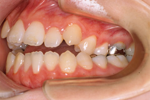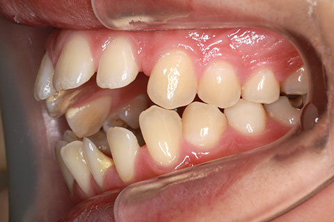 奥歯は咬んでいるが前歯は咬んでいない状態。奥歯でしか咬み合わず、奥歯への負担が非常に大きくなります。また、幼少期の舌の癖や指しゃぶりが主な原因で、そのまま大人になると治療が難しくなる可能性があります。