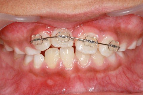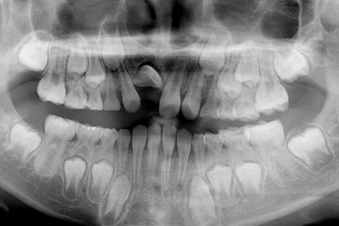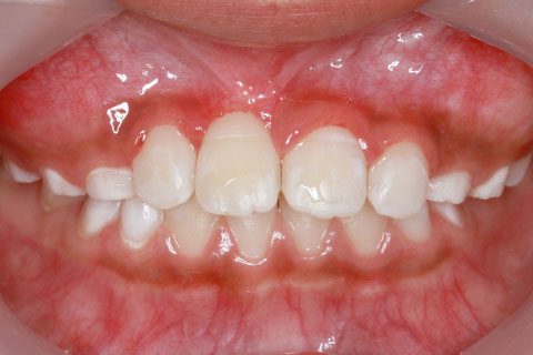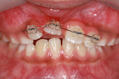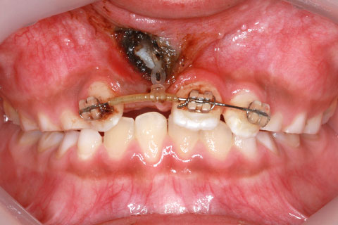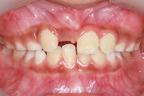 子供の乳歯が抜けて、かなりの時間が経つのに永久歯が生えてこないと心配して来院される親御様は多くいらっしゃいます。この場合、レントゲンにて確認すると大体の場合、もうしばらく待っていれば生えてくるであろうと予測がつきます。しかし、稀に歯の位置異常により、埋まったままの状態で生えてこないことがあります。この場合、待っていても生えてきませんので、矯正力により歯を引っ張り出す必要があります。これを矯正学では開窓・牽引術と呼び、歯肉を切開して、歯の表面を露出させ、そこに矯正器具を付けて、良好な位置まで引っ張り出すという治療法です。
