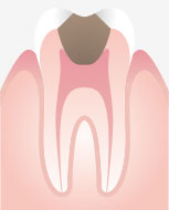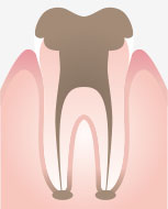 虫歯がもっとも進行した状態です。歯根の部分だけが残って歯髄は腐敗しています。顎の骨まで及ぶと痛みが出たり、腫れたりします。