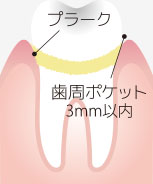 歯肉は引き締まっていて、淡いピンク色をしています。歯槽骨の吸収もなく、歯根膜の破壊もない状態です。歯周ポケットも認められません。