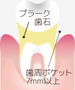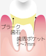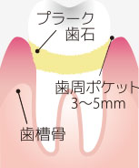 歯周ポケットに歯垢や歯石がたまります。歯茎から出血したり、膿が出たりし、歯槽骨が溶け始めます。