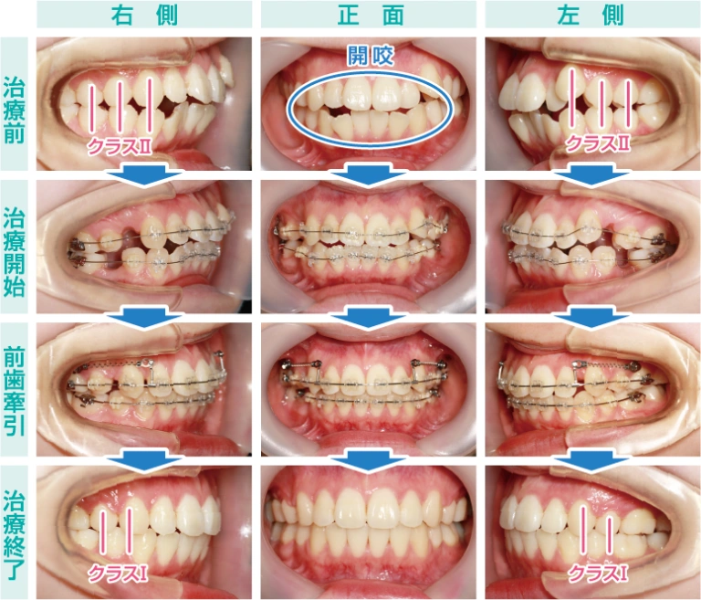本症例では、下顎5番の抜歯によりクラスIへの是正を容易にし、臼歯関係を確立した段階で前歯を舌側方向へ牽引しました。抜歯スペースを利用して前歯を後方へ移動させると、自然な力の方向により開咬が改善し、適切な被蓋が得られます。